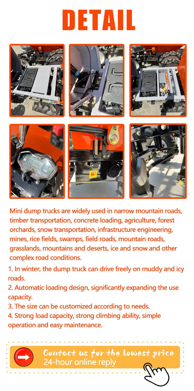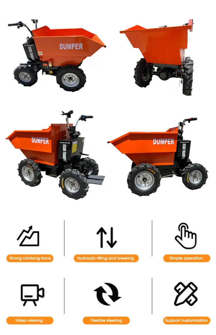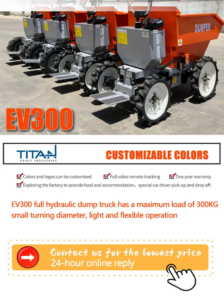 Model EV300 Rated Load Capacity 300kg Overall Dimensions 1408*740*965 Turning Radius 1.5m Curb Weight 170kg Bucket Capacity (m³) 0.23m³ Operating Time (h) 4h Charging Time 5-6h Charging Voltage 220V/50Hz Gradeability 15° Battery Manufacturer Tianneng Battery Model 48V20ah Motor Power 700W Gear Ratio 1:28 Tire Size (Front) 4.00-10 Tire Size (Rear) 4.00-8 Tire Pressure 0.25 MPa Forward Speed (High) 15 km/h Forward Speed (Medium) 12km/h Forward Speed (Low) 9km/h Reverse Speed 6km/h Getting Started